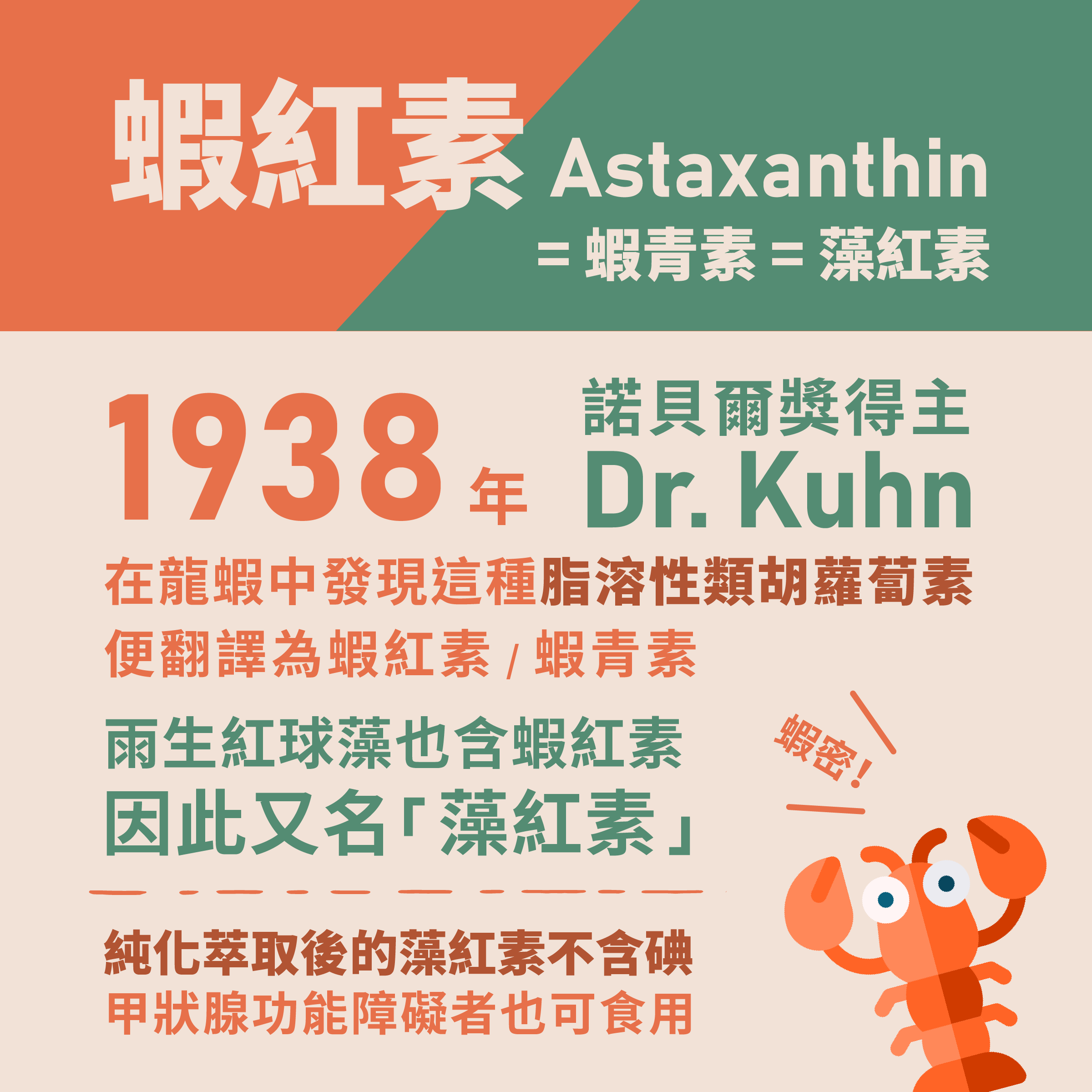 Astaxanthin 是一種脂溶性的類胡蘿蔔素,諾貝爾獎得主 Dr.Kuhn 於 1938 年在龍蝦中發現這種營養素,因此中文譯為蝦紅素、蝦青素。