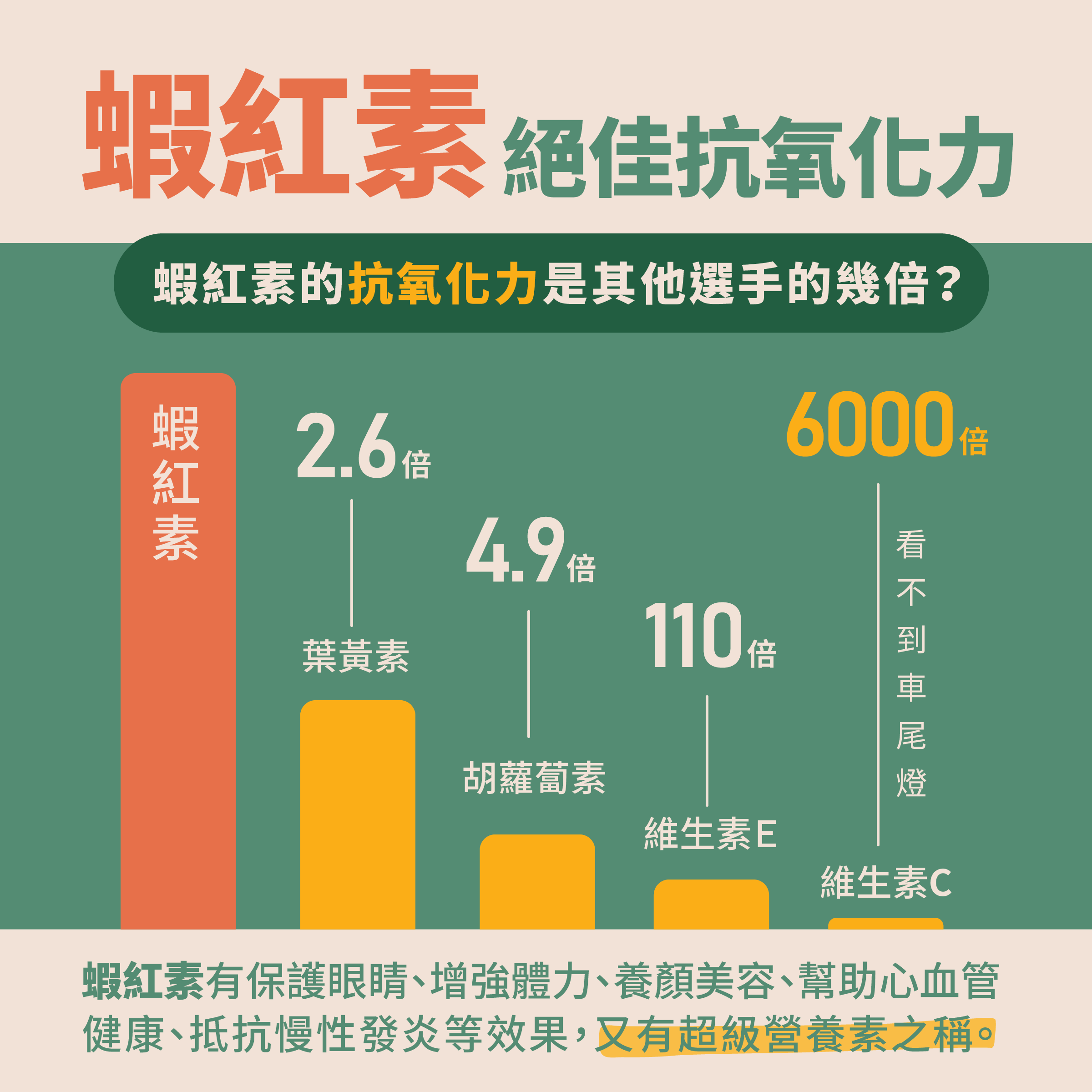 蝦紅素的抗氧化能力有多強呢?是維生素 E 的 110 倍,更是維生素 C 的 6000 倍!