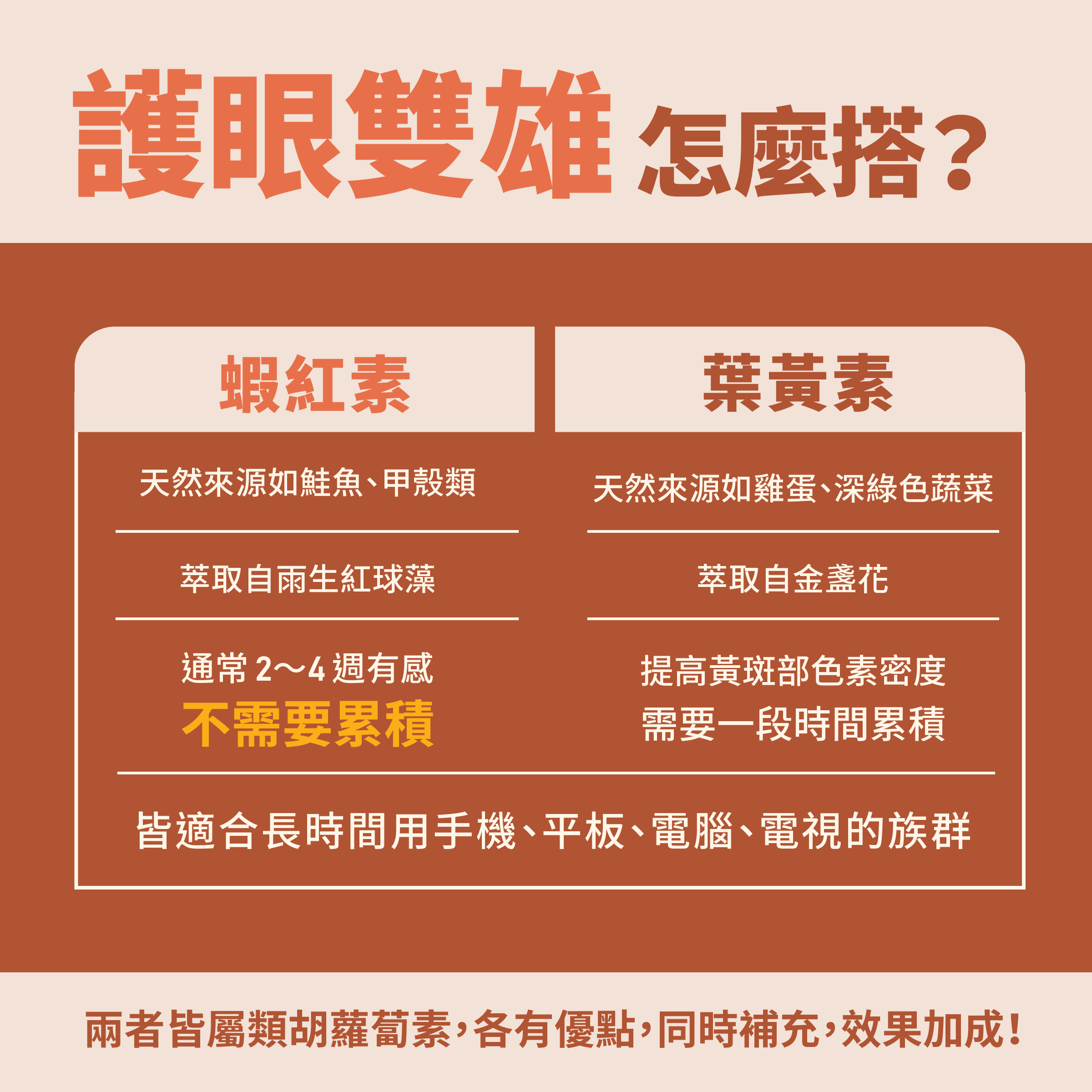 蝦紅素、葉黃素皆屬於類胡蘿蔔素家族,各有優點,難互相取代,因此經常同時使用,可使護眼效能更加分!