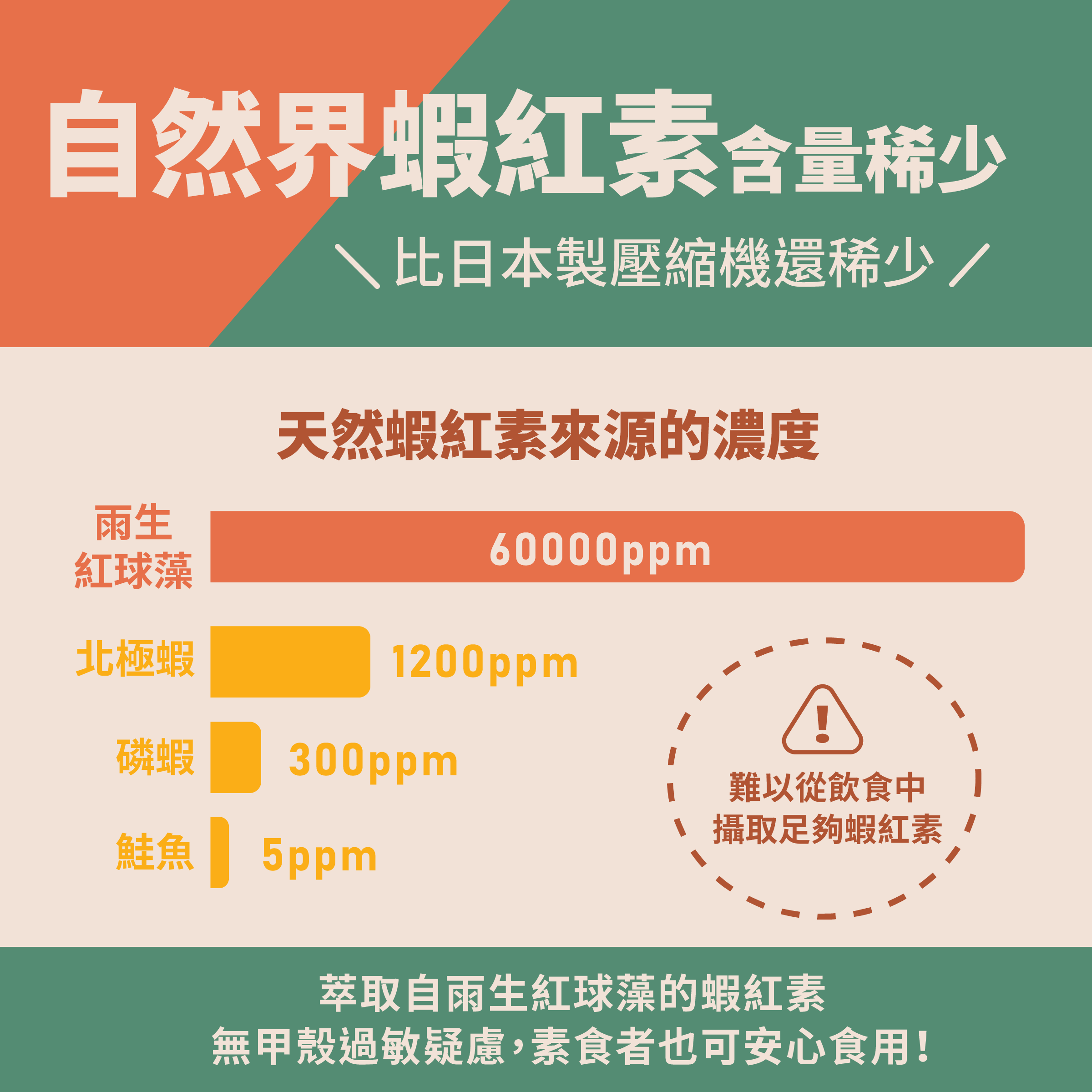 天然蝦紅素的來源,如雨生紅藻球、北極蝦、磷蝦、鮭魚等等,但含量差異非常大。若要從自然飲食中攝取足量蝦紅素,幾乎是不可能的任務,畢竟,誰每天能吃一公斤以上的鮭魚呢?