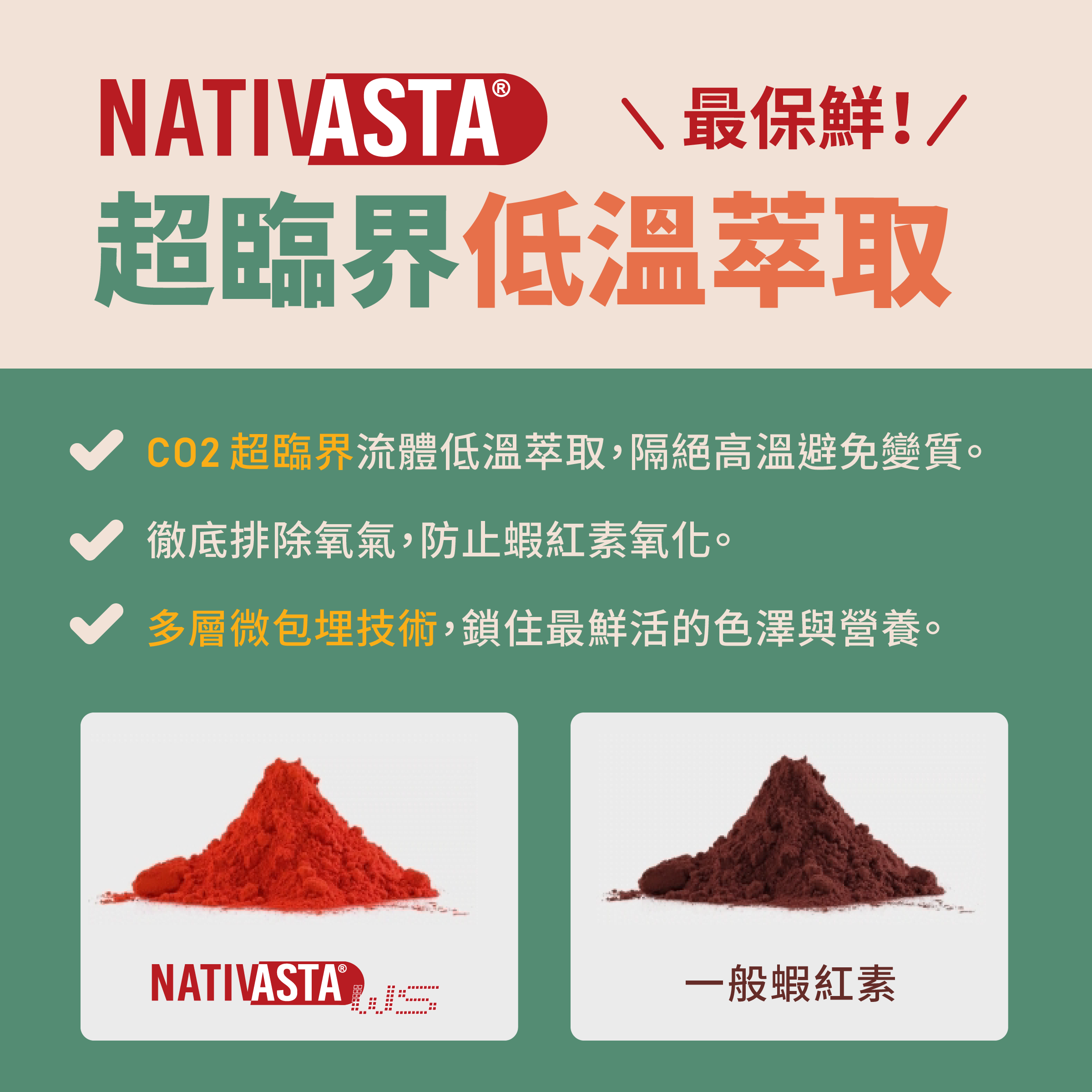 NATIVASTA® 的超臨界低溫萃取專利技術,以環保無毒的二氧化碳為溶劑,在高壓、低溫環境下將氣態二氧化碳轉換為超臨界流體,於耐高壓的不鏽鋼萃取槽中,穿透藻類厚實細胞壁,萃取脂溶性蝦紅素。