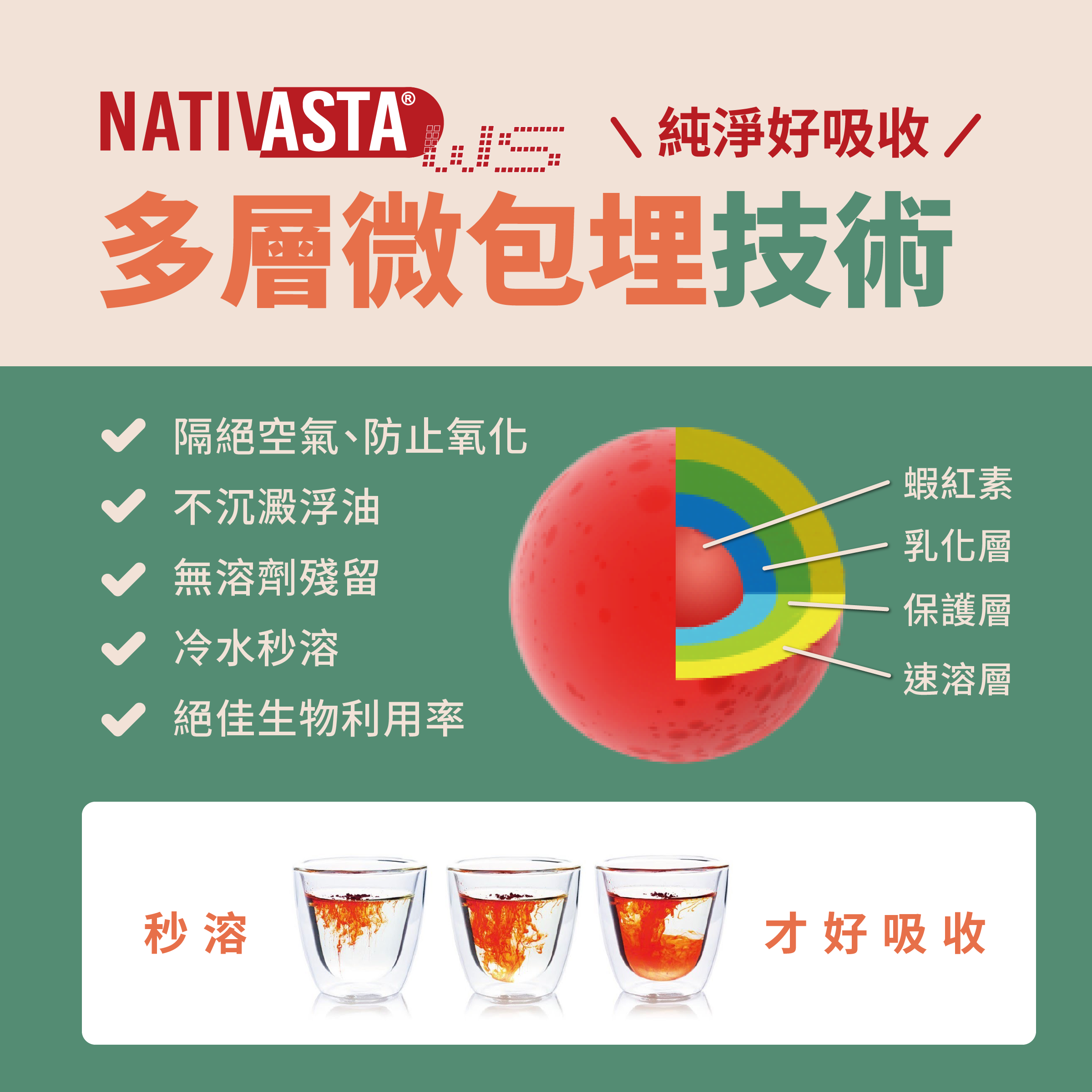 除了超臨界低溫萃取專利技術,在萃取出蝦紅素之後,要再以 NATIVASTA® WS 的多層微包埋技術,徹底隔絕外界空氣,防止氧化,並有效提高蝦紅素生物利用率。